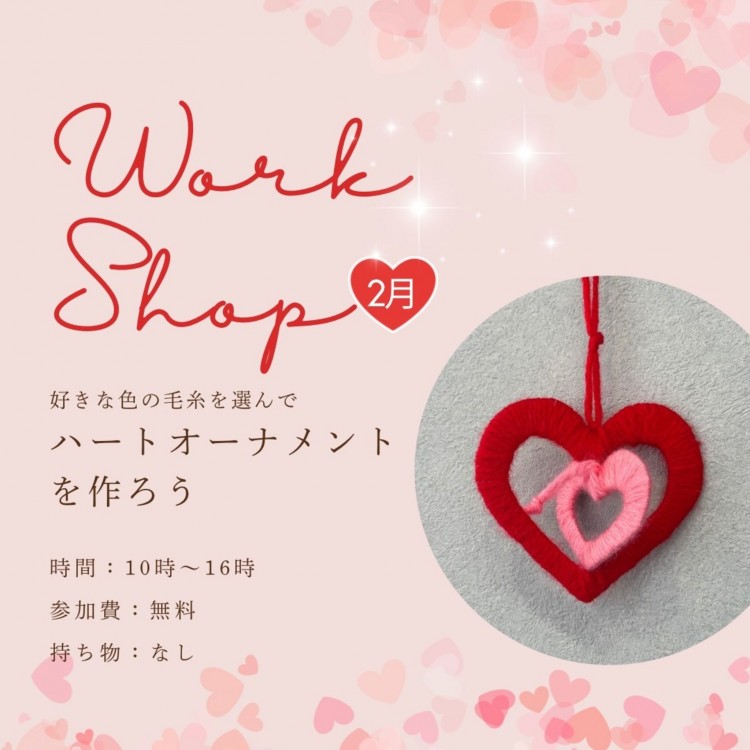 2月のワークショップは、好きな色を選んでつくるハートオーナメントづくりを開催します!